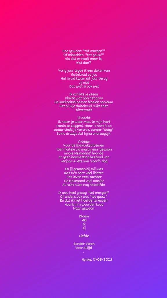 In 2021 verloor ik geheel onverwacht mijn echtgenoot. Ik kon veel, maar tegelijkertijd ook helemaal niets meer. Schrijven, dat wel. Een enkele keer deel ik een fragment daarvan op social media. Na een poos bevroren geweest te zijn, probeer ik het leven weer terug te pakken, in beweging te komen, en sta ik weer terug op het toneel.